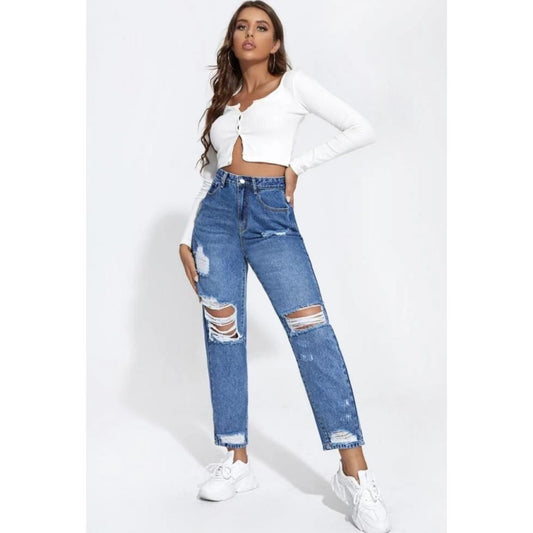 Highwaist Whiskers Mom Fit Distressed Denim In Stone Blue