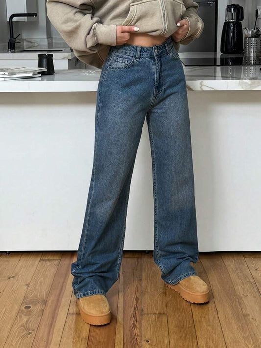 Highwaist Ball Blast Straight Fit Wide Leg Denim Dusty Blue