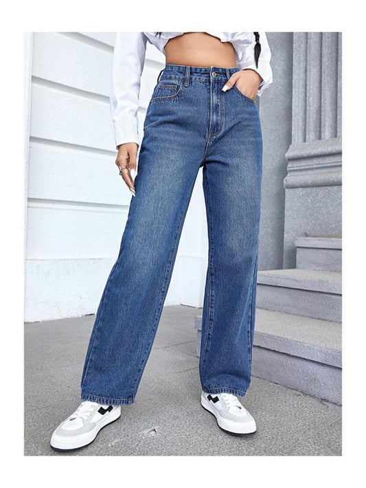 Highwaist Whisker Straight Fit Wide Leg Denim In Dark Blue